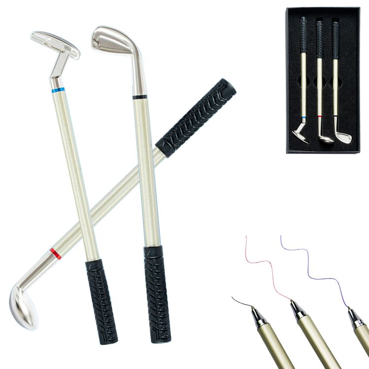 Crafted from durable aluminum alloy, this golf club inspired pen set blends form and function for everyday writing or as a gift. Each set includes three metal ballpoint pens housed in a sleek silver case featuring precision silk-screen printing. The laser-engraved barrels showcase a sporty golf motif and are built to resist pressure and wear. Designed for smooth, reliable ink flow, the pens are easy to disassemble for quick refills and color changes. Black, red, and blue rings below each barrel indicate ink color for easy identification. Whether at the office, in a classroom, or as a gift, this set delivers writing comfort with a refined edge.