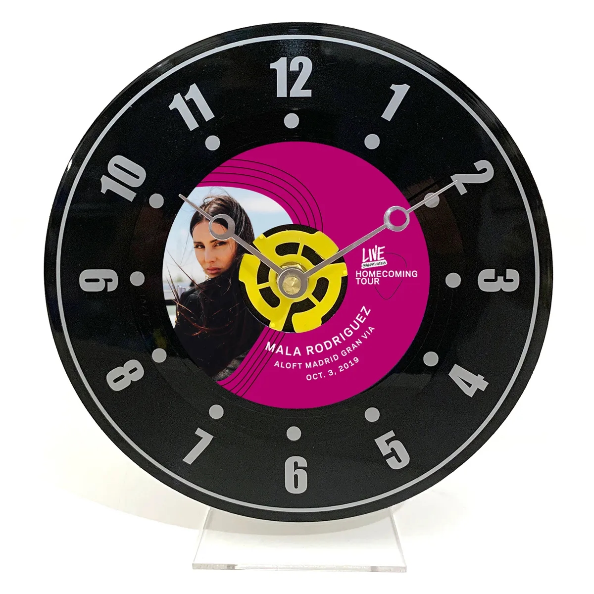 7" Records transformed into the coolest clocks - great for merchandise, gifts, or table displays. Made with original 7" vinyl records. Vinyl applique numbers stand out and are easy to read. Full color imprint on the center record label. Individually packaged in a corrugated, windowed display box. Comes on acrylic stand. or can be made as a wall clock. Quartz movement requires a single AA battery.