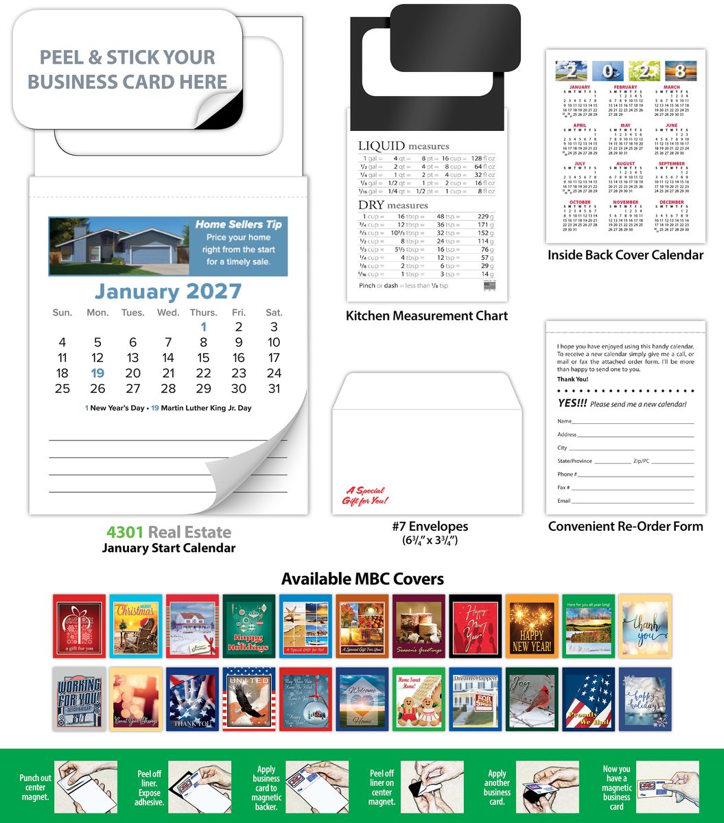 - Attach your business card to this Real Estate themed 12-month magnetic business card (M.B.C.) calendar and leave a lasting impression with your customer.